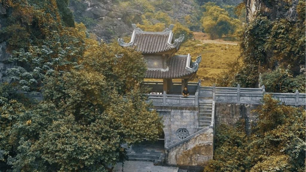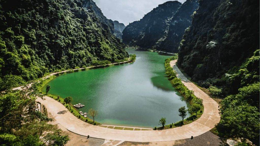 Tuyet Tinh Coc (Am Tien Cave) is located within the Hoa Lu heritage site, distinguished by its emerald green lake surrounded by limestone mountains.